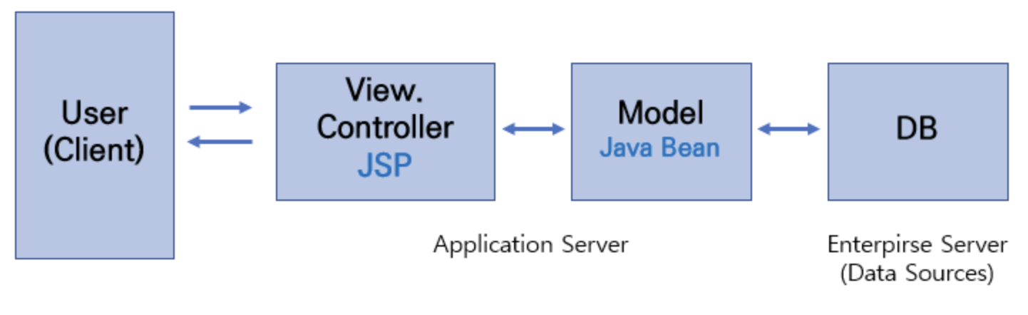 - MVC1 패턴은 View와 Controller를 JSP가 담당하는 형태입니다.